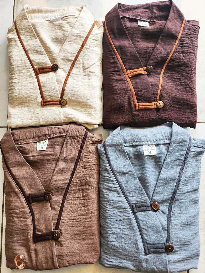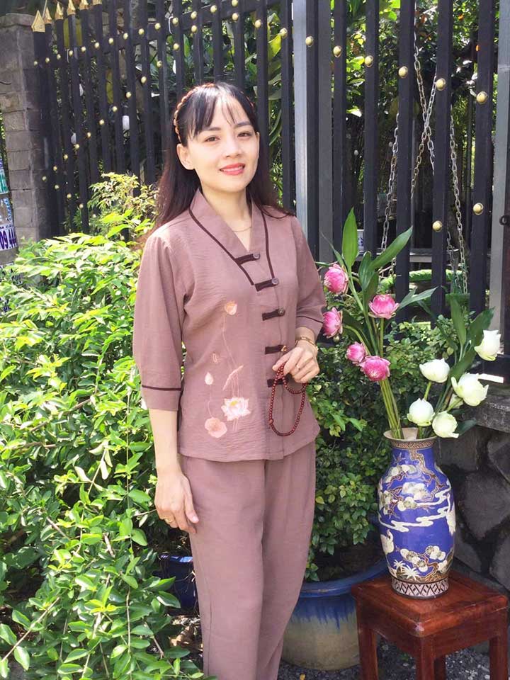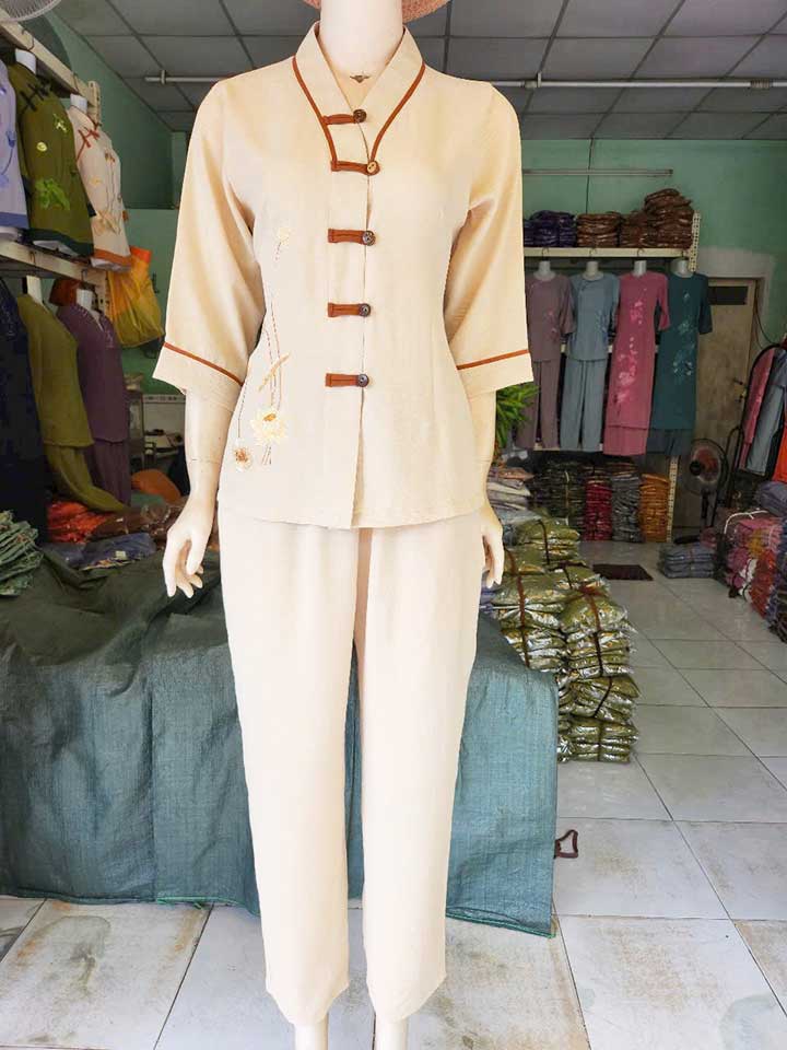 Các nút áo được làm từ gỗ, đính dọc theo vạt xéo một cách khéo léo, giúp tổng thể trang phục thêm hài hòa và ấm cúng. Dáng áo rộng rãi, thoải mái, tay lỡ hoặc tay dài tùy mẫu. Kết hợp với quần ống suông cùng màu, tạo nên sự trang nghiêm và thanh thoát cho người mặc.