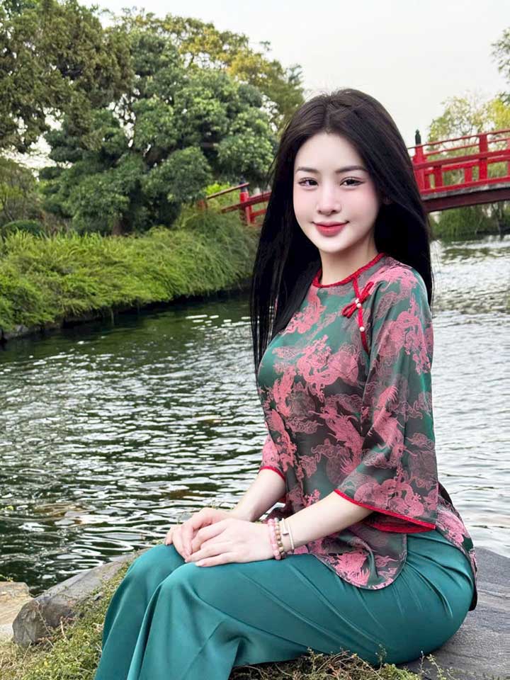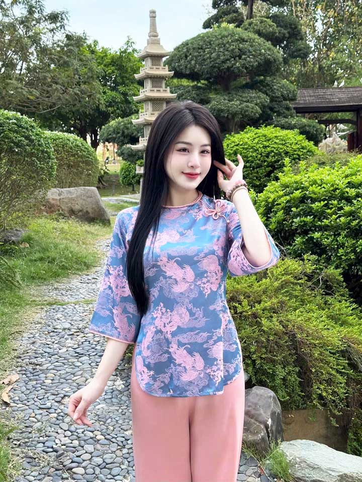 Áo dáng suông rộng, cổ tròn hoặc cổ đứng thấp. Phần nổi bật nhất chính là các đường bính chạy viền – thường bắt đầu từ cổ áo, kéo dọc theo đường cài nút, viền tay áo và gấu áo. Các đường bính này được nổi gờ lên nhẹ, tạo thành khối tròn liền lạc, bên ngoài bọc vải gấm.