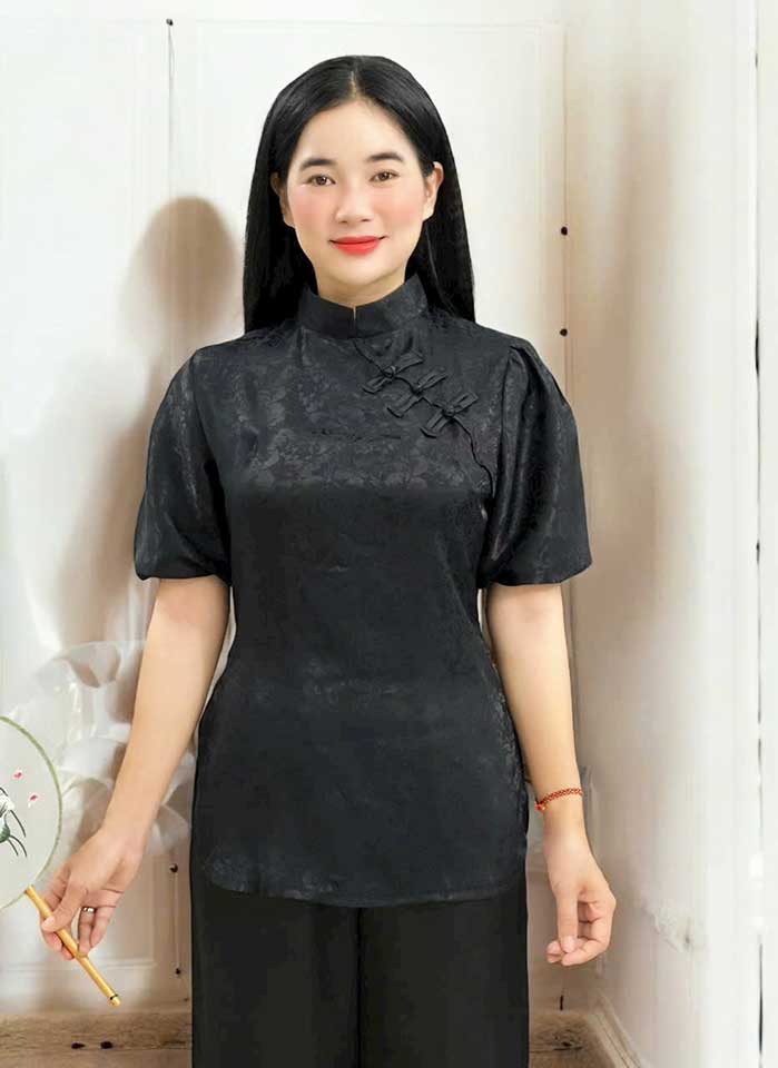 Dáng áo suông dài, thường phủ mông hoặc ngang đùi, giúp che dáng, kín đáo mà vẫn thoải mái khi di chuyển, ngồi thiền.Cổ áo tròn cao hoặc cổ tàu thấp, gọn gàng, tạo vẻ trang nghiêm và thanh lịch.Hàng cài 4 nút vải to bản, được bọc cùng chất liệu với áo, thường may lệch sang một bên hoặc giữa ngực – đây là đặc điểm nhận diện của kiểu “áo lam tàu”.Tay áo dài, suông hoặc hơi ôm, giúp che phủ cánh tay nhưng không gây gò bó.