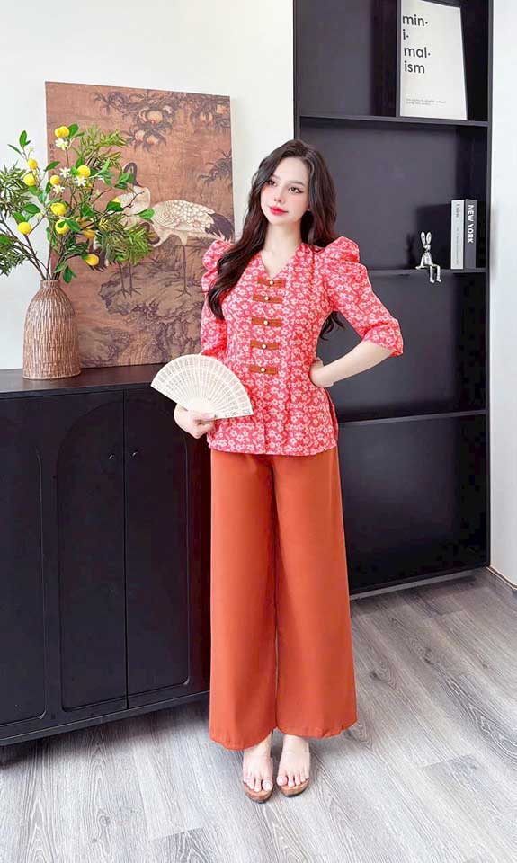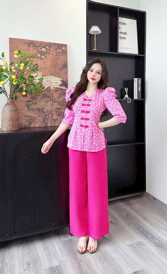 Áo giữ kiểu dáng suông nhẹ đặc trưng của áo bà ba, ôm vừa vặn cơ thể nhưng vẫn thoải mái khi vận động. Hàng cúc phía trước được may tinh tế, có thể là cúc bọc hoặc cúc ngọc nhỏ tạo điểm nhấn duyên dáng.